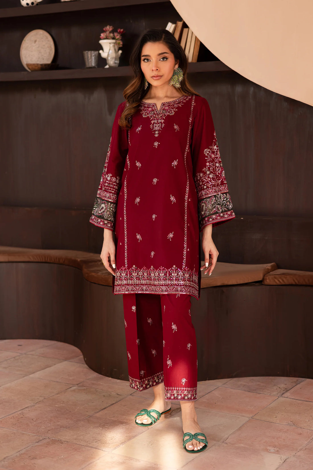 W-356 2Pc Maroon Cotton Embroidered Dress
