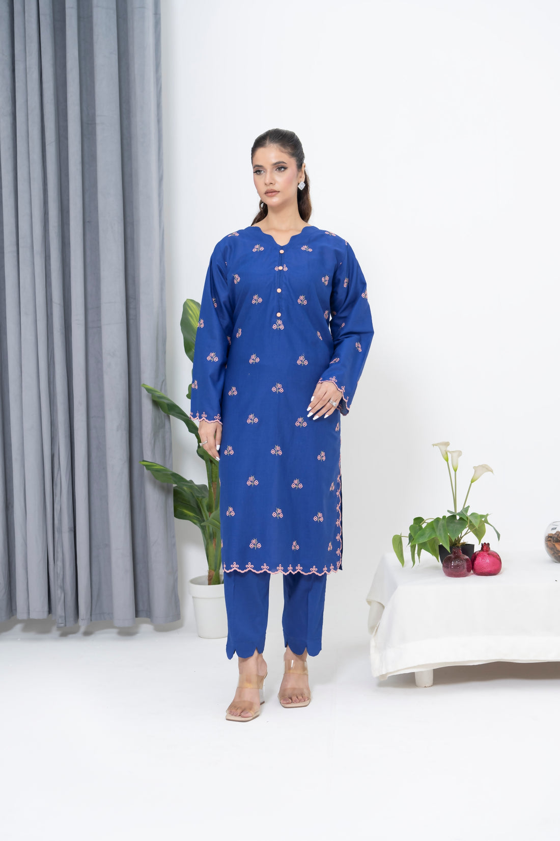 S-601 2PC Cotton Stitched Blue Embroidered Shirt + Culotte
