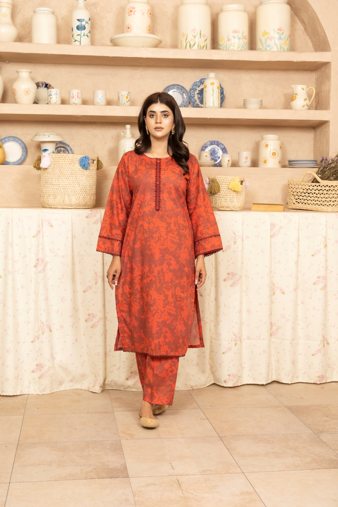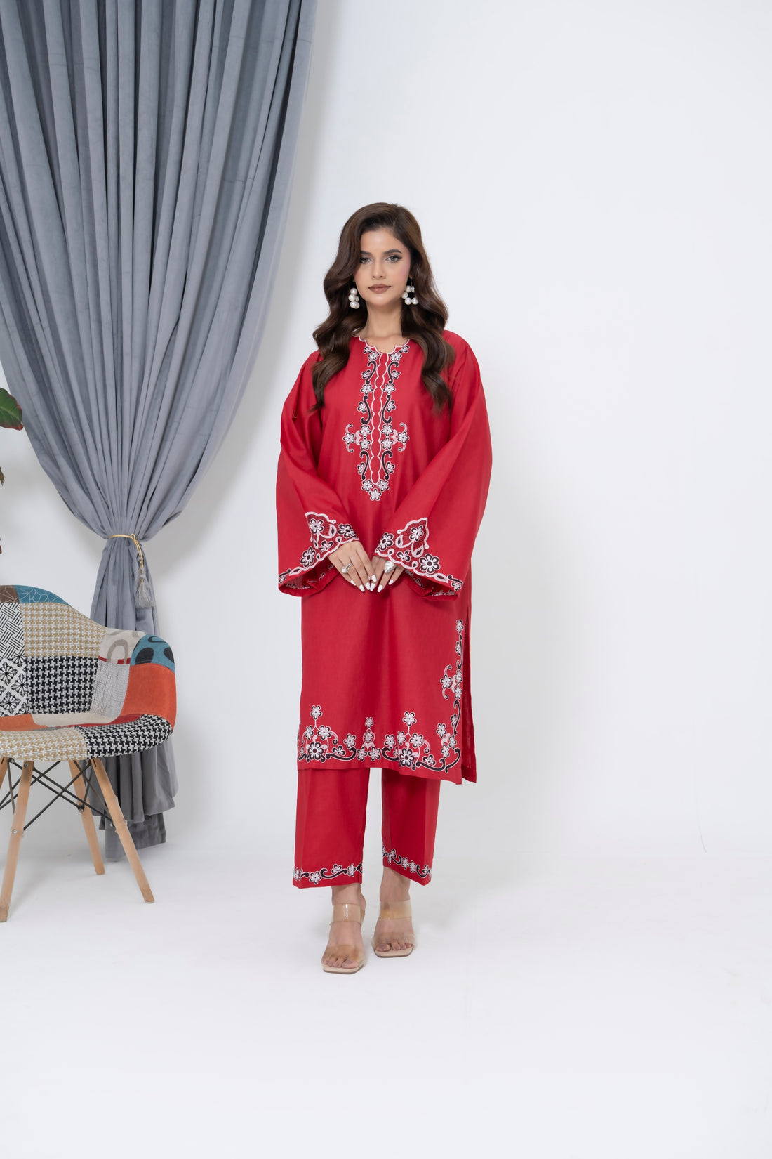 S-604 2PC Cotton Stitched Red Embroidered Shirt with Trouser
